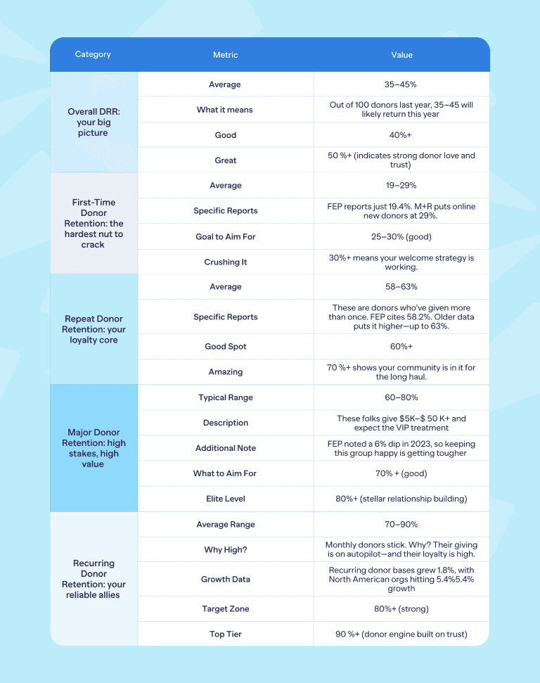 - Focus energy on recurring and major donors—they’re steadier (hello, 70–90% DRR).