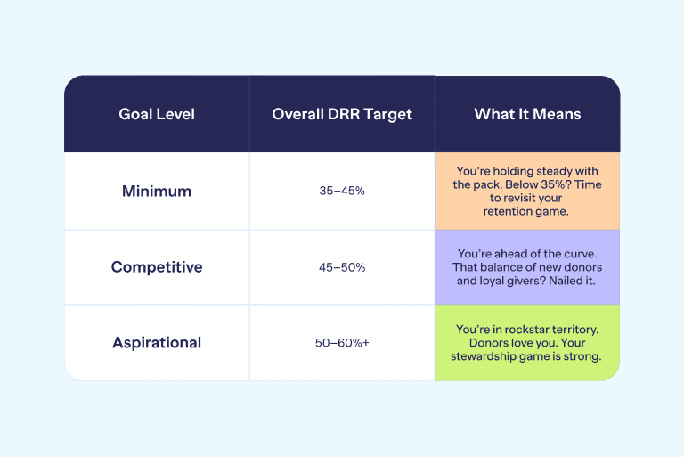 Recurring giving is your DRR hero. While average DRR might hover around 35–45%, recurring donors stay loyal—really loyal—with 70–90% retention.