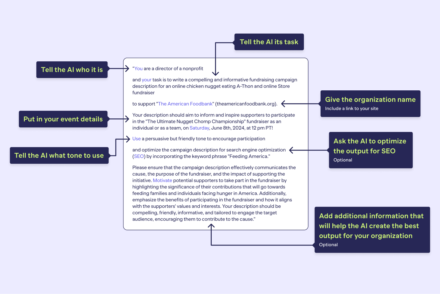 A prompt is a written body of text describing to the AI what you want the AI solution to accomplish. Prompts should be short, concise and detailed. The prompt provides context to the AI about the kind of fundraiser you want to run. Prompts should include details like: