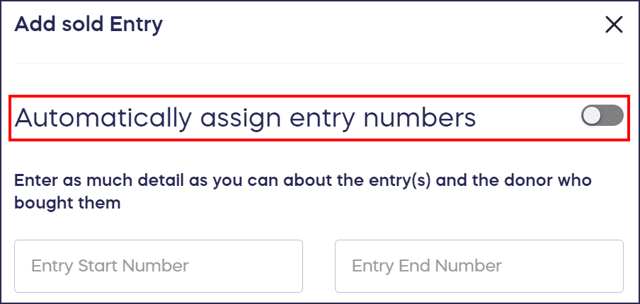 The system will ask for the start and end numbers for the entries that were sold to each person. You can have the system automatically assign entry numbers or manually assign your own entry numbers: