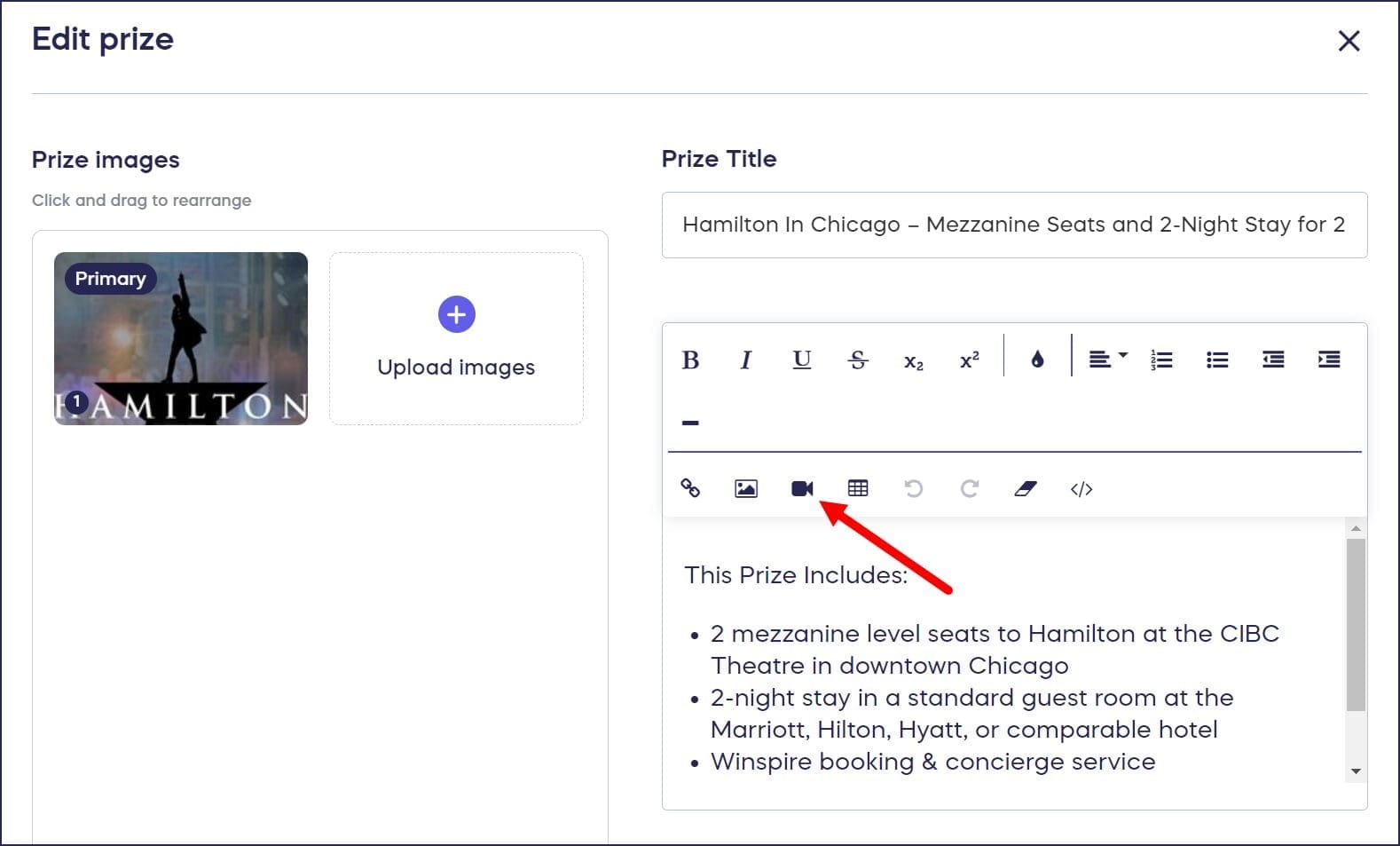 - Navigate to the Campaign item in question (e.g., if you want to add a video to a Raffle prize, go to Raffle in the timeline at the top and scroll down until you find the prize).