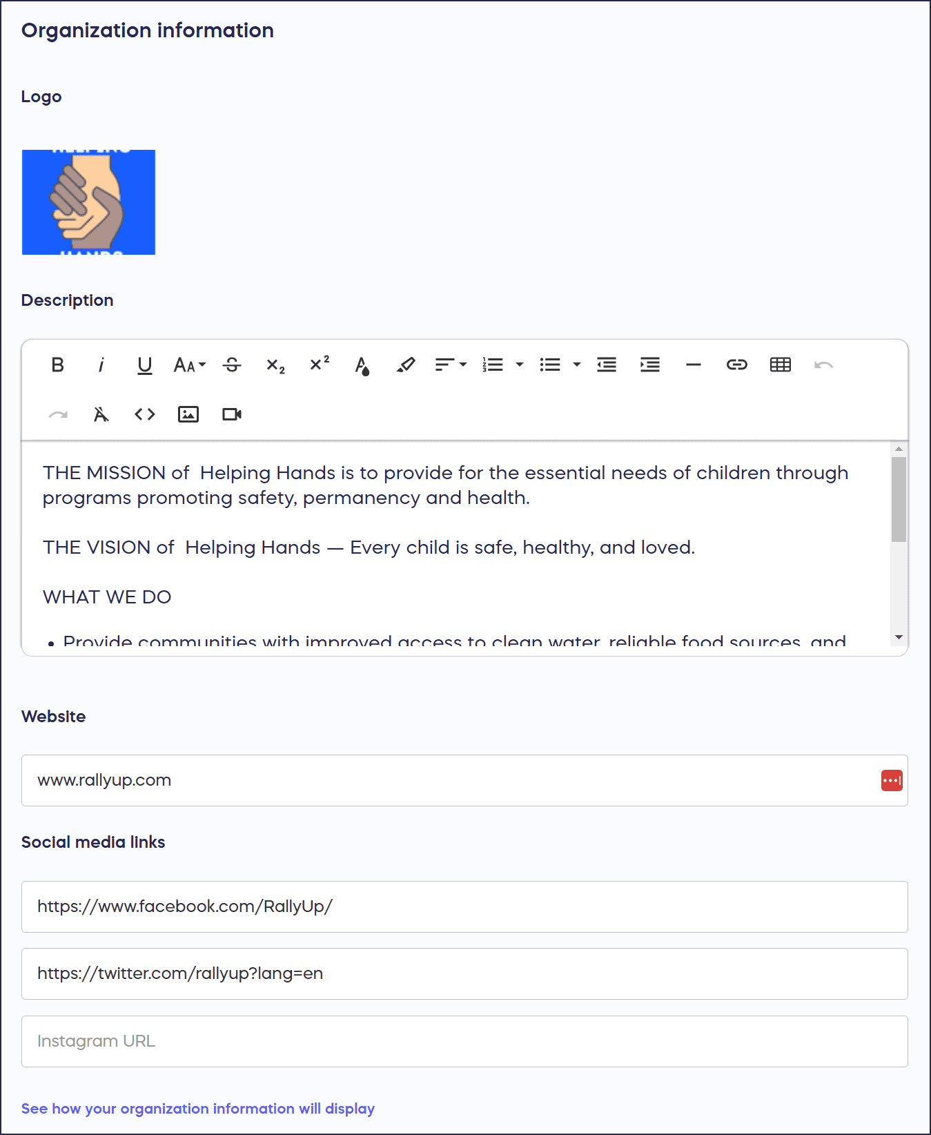 RallyUp allows you to add a logo and description of your organization to your account profile. By default, your organization description and logo will appear under the Meet the Organization section on every Campaign Page: