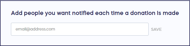 - Scroll down to Add people you want notified each time a donation is made, add the email address you would like to receive notifications, and select SAVE: