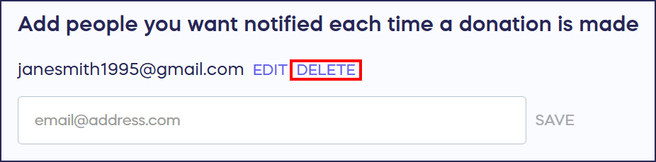 - Scroll down to Add people you want notified each time a donation is made and select DELETE next to the email address(es) you wish to remove: