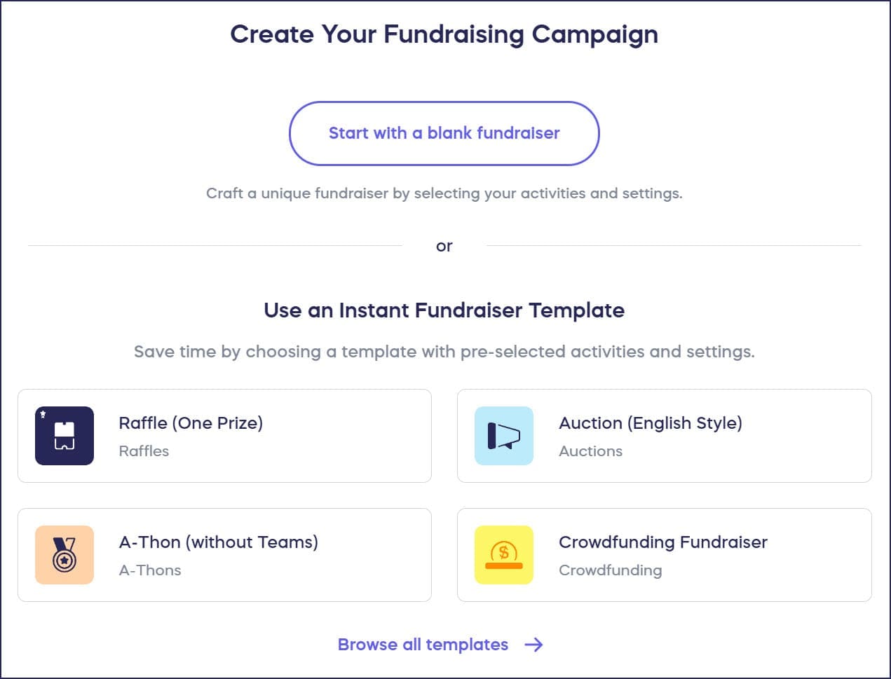 - Start with a blank Campaign or select an Instant Fundraising Template with pre-filled settings: