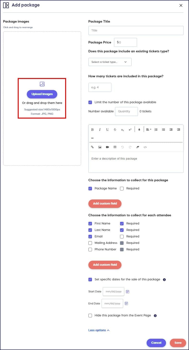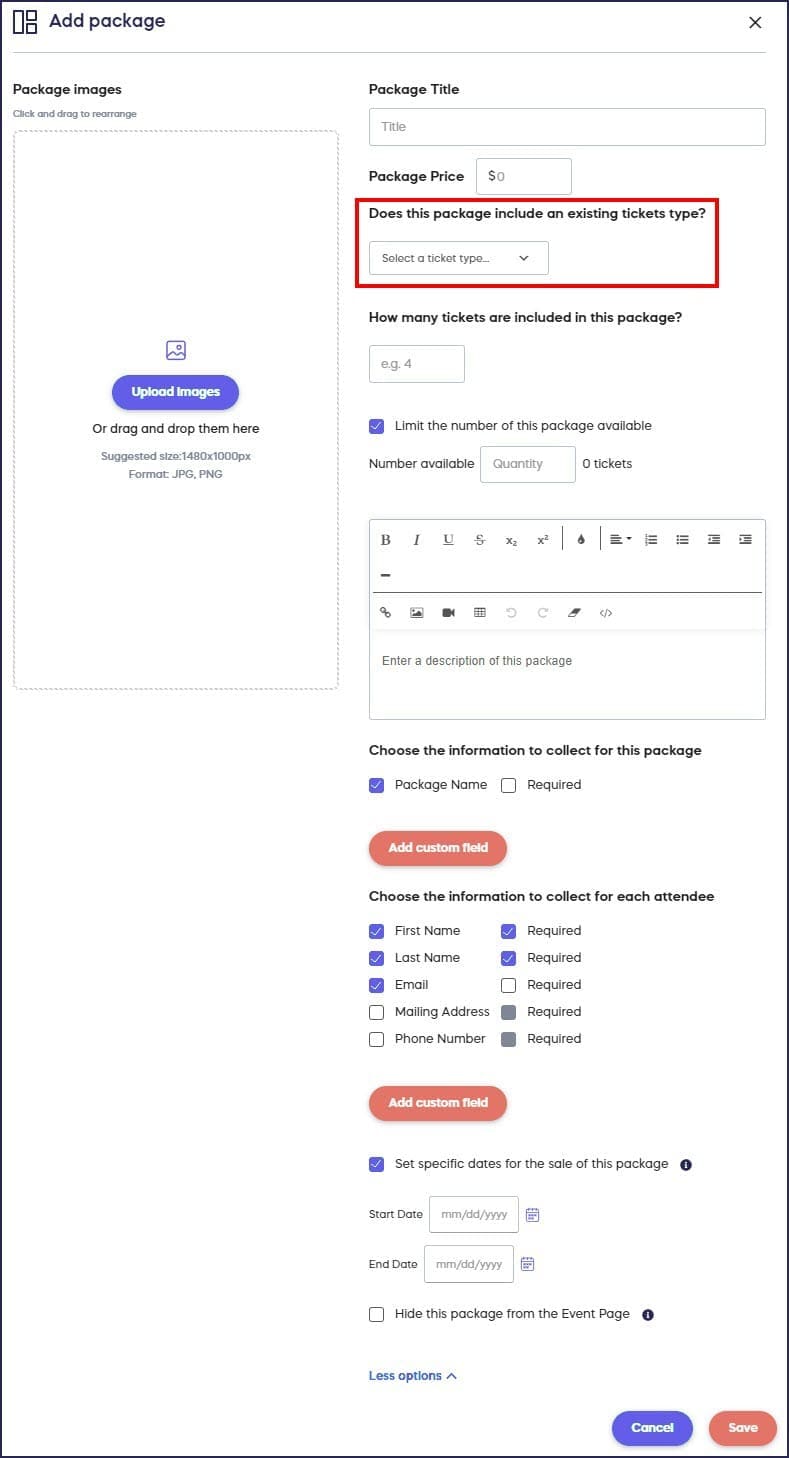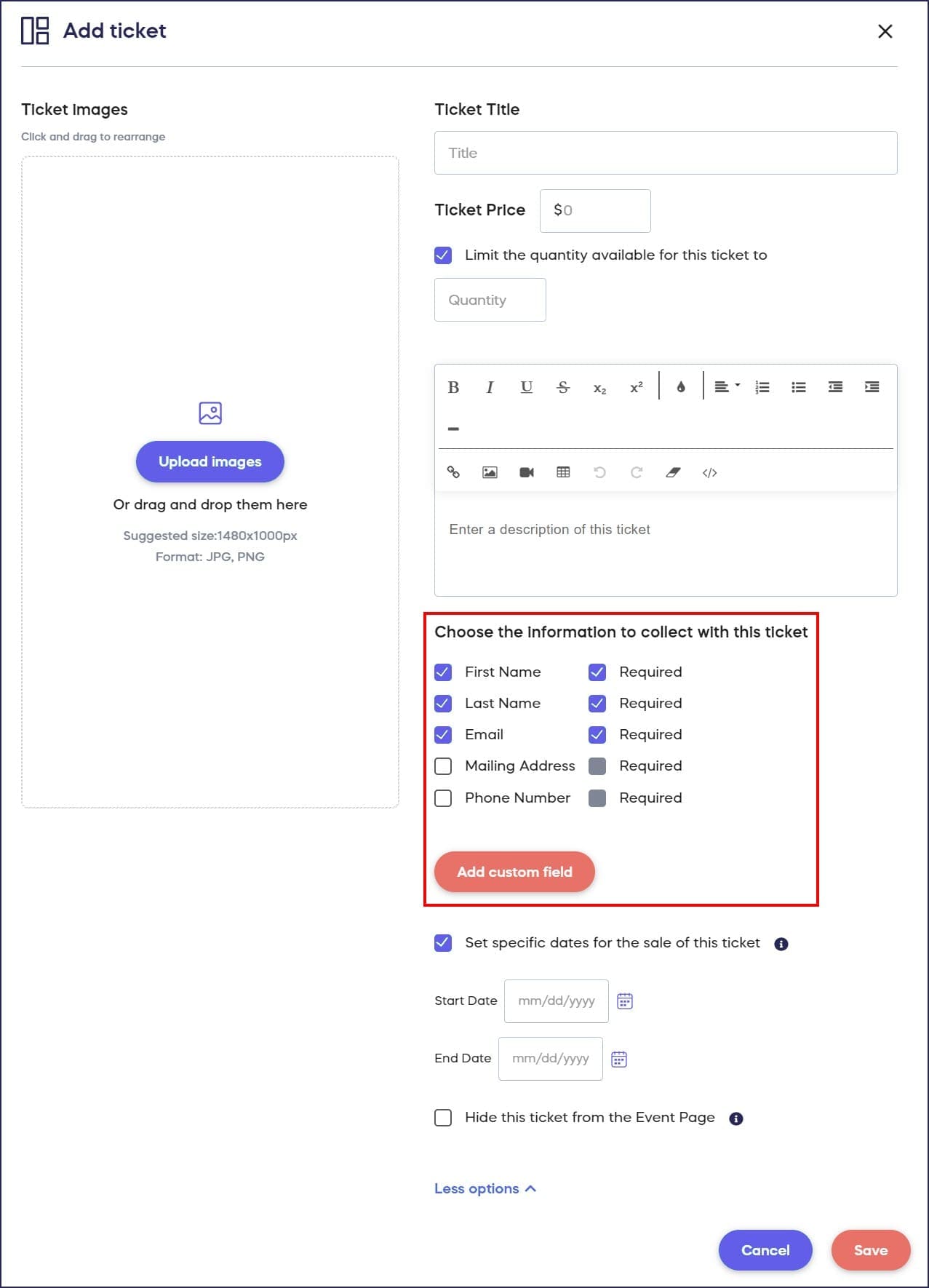 Custom fields allow you to collect information from attendees. You can collect the same information from all attendees, add unique custom fields to each Ticket or Table option, and make each field either required or optional. Use custom fields to: