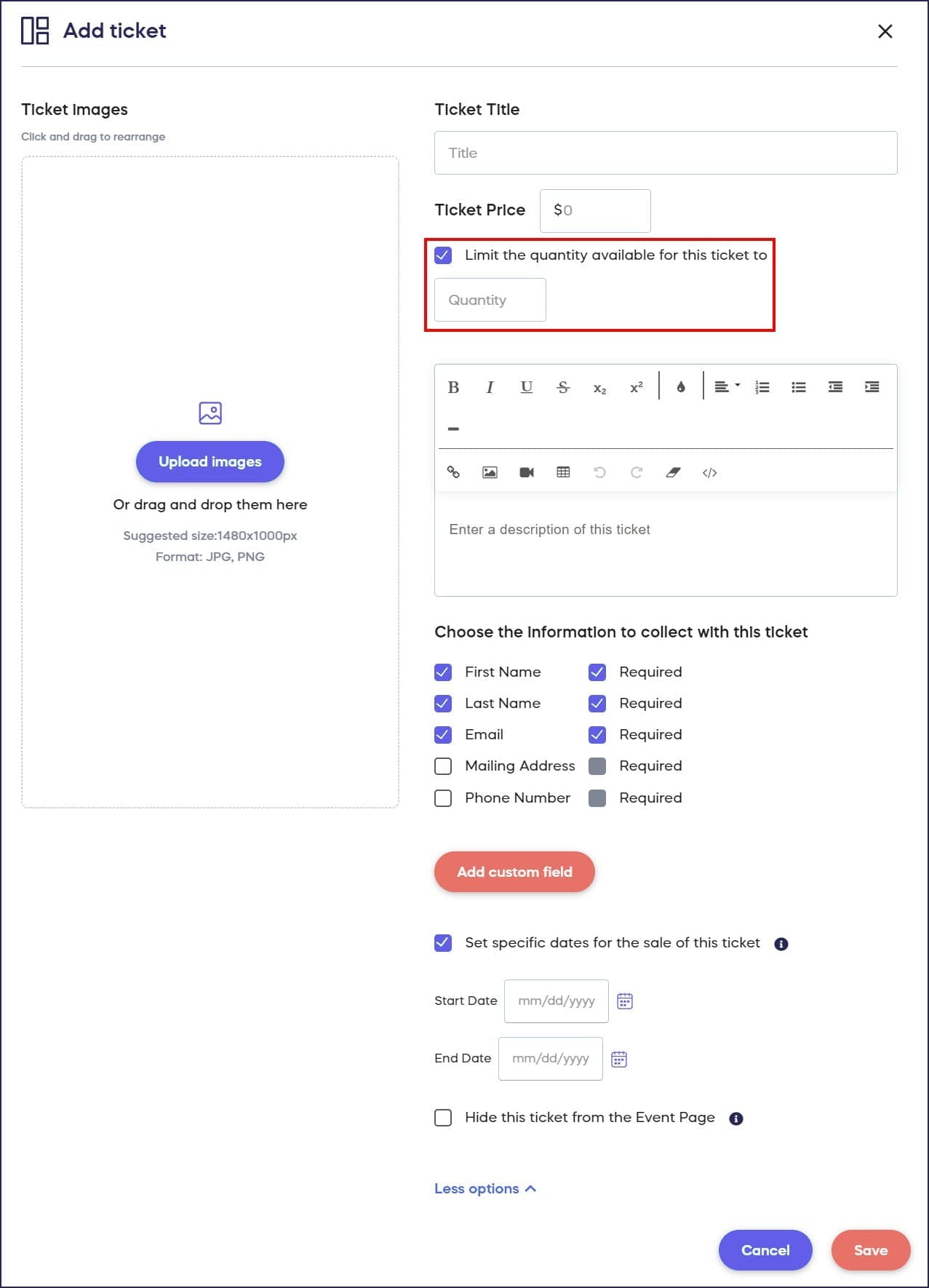 - To set a quantity limit, check the box next to Limit the quantity available for this Ticket* and enter the number available: