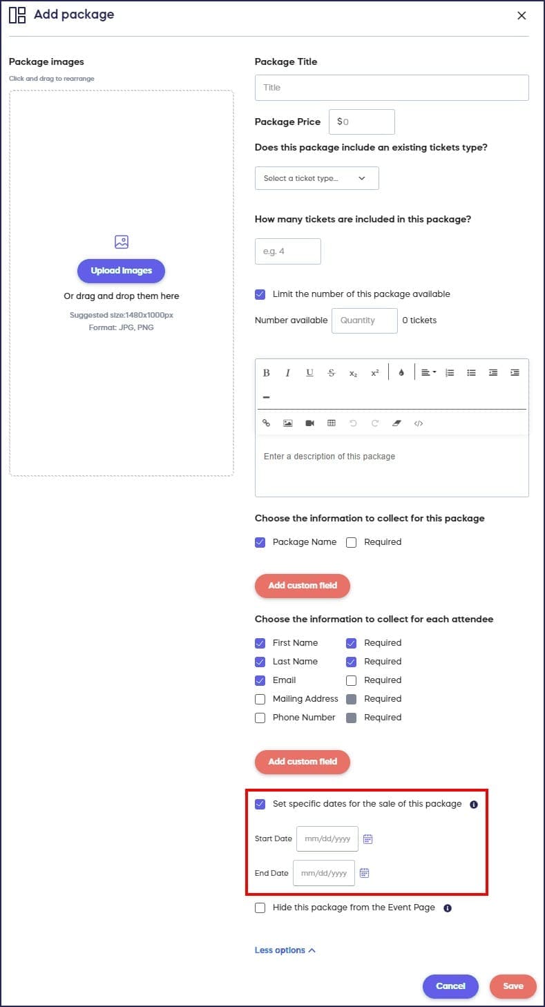 - To set a time limit, click on More Options, check the box next to Set specific dates for the sale of this Ticket*, and choose the dates: