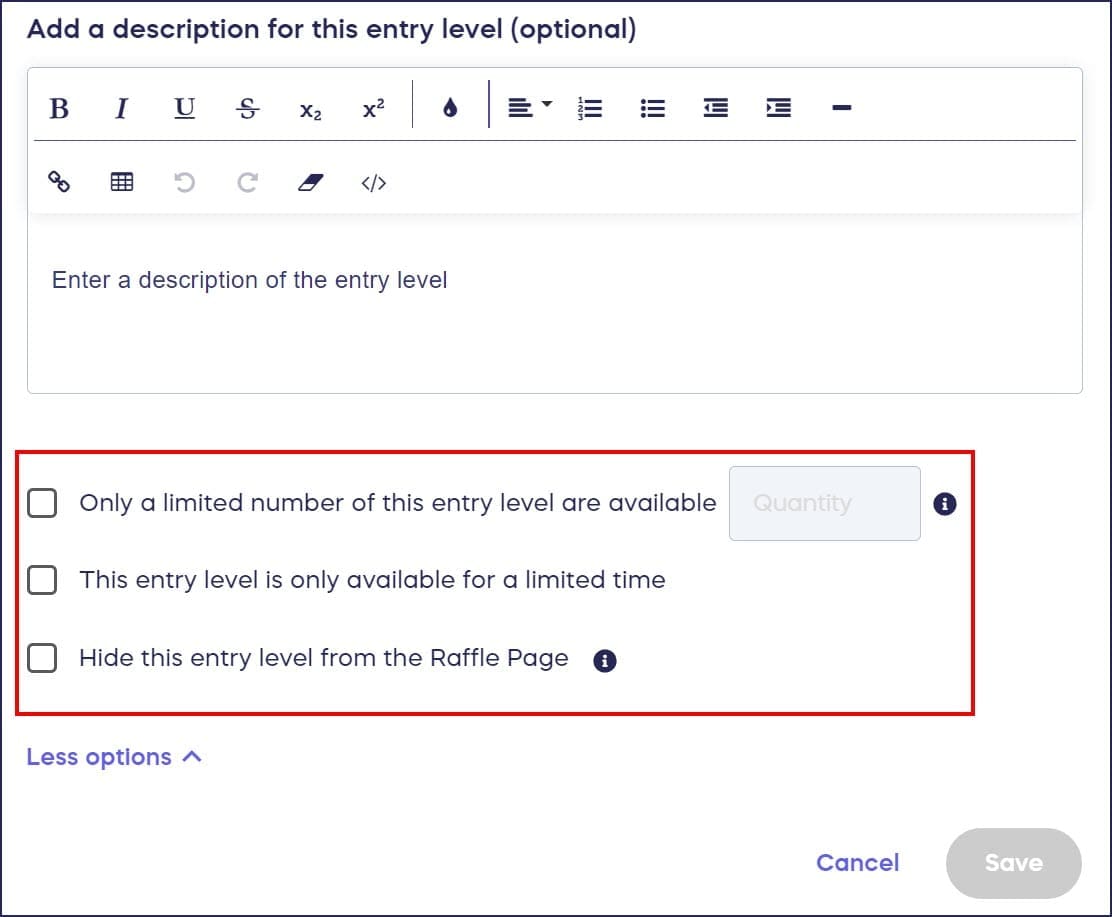 If you don’t want to display one of your entry levels right away, you can hide it from donors until you’re ready to use it. When an entry level reaches its time or quality limit while your Raffle or Sweepstakes is still live, you can update this setting to hide it from the Campaign Page. If you hide an entry level, any purchases already made will still count towards the drawing and will not be deleted.