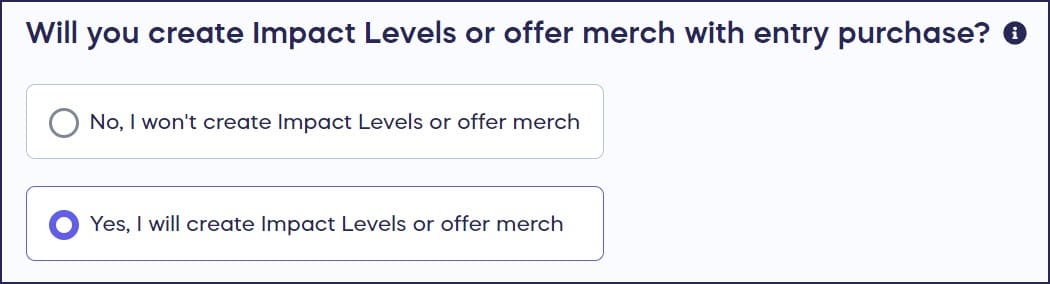 - Scroll down to Will you create Impact Levels or offer merch with entry purchase? and select Yes, I will create Impact Levels or offer merch: