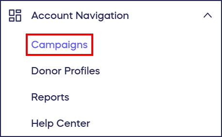 After creating your account or logging in, you can verify your administrator access by checking the Campaigns section. If you’ve been successfully added as an administrator, you should be able to find the Campaign by going to Account Navigation in the left menu and selecting Campaigns: