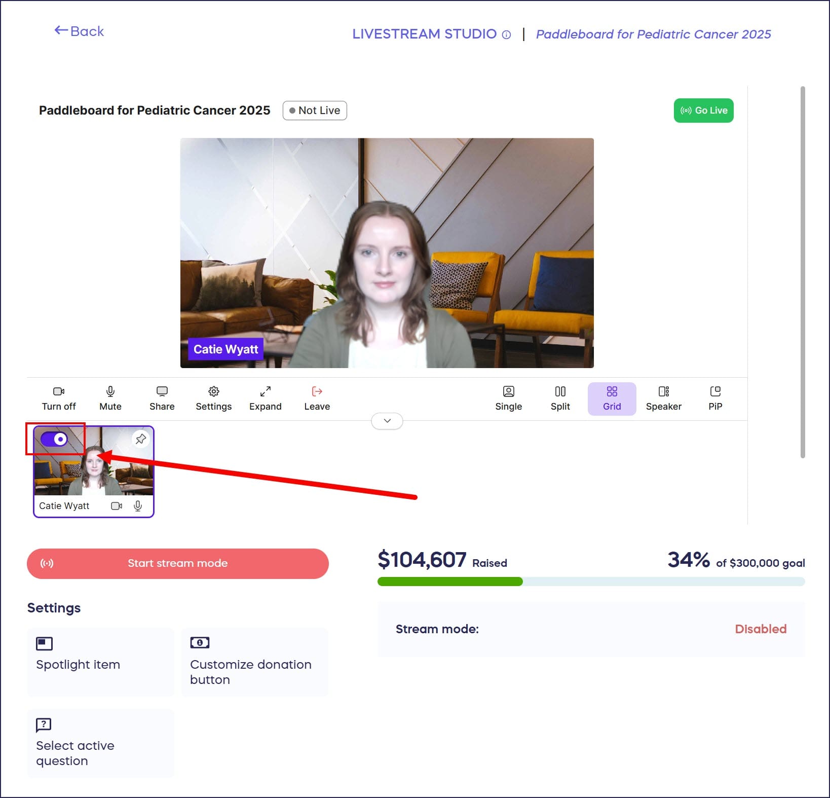- When you’re ready to present, unmute yourself and click on the toggle to go onstage: