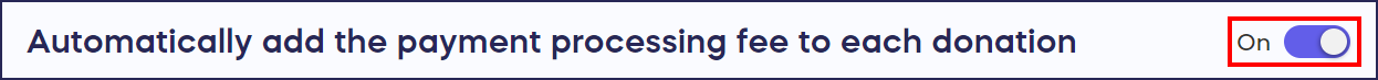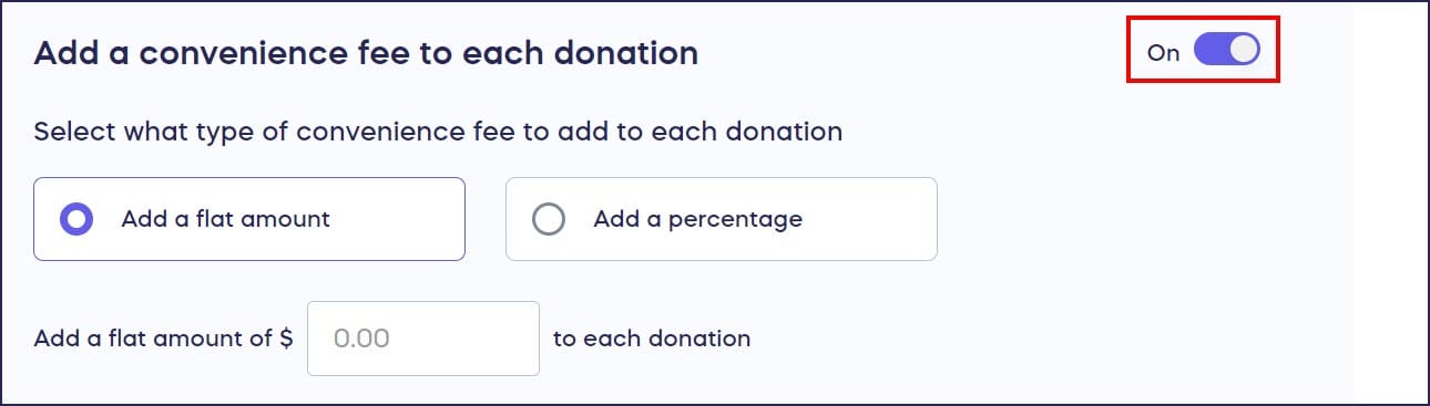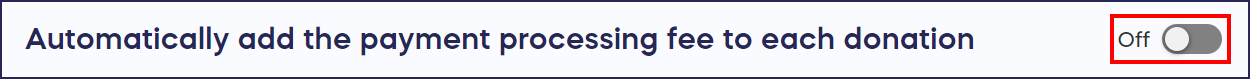 - Scroll down to Add a convenience fee to each donation and click on the toggle so it shifts to the right: