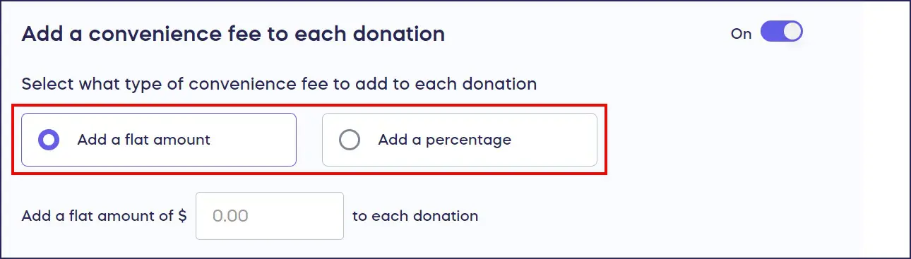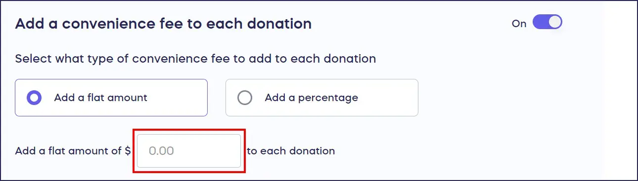 With this option, a fee is added to each donation to help offset costs, and donors cannot opt out. Your organization keeps the donation amount minus whatever the convenience fee doesn’t cover. If the convenience fee fully covers all fees and there’s some left over, your organization keeps that money. You can choose to add a flat dollar amount to each donation or calculate the fee as a percentage of the donation amount.
