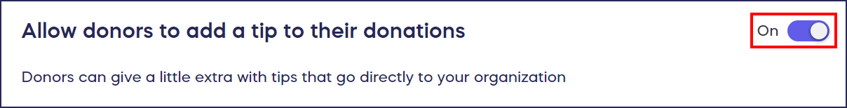 - Scroll down to Allow donors to add a tip to their donations and click on the toggle to move it to the right: