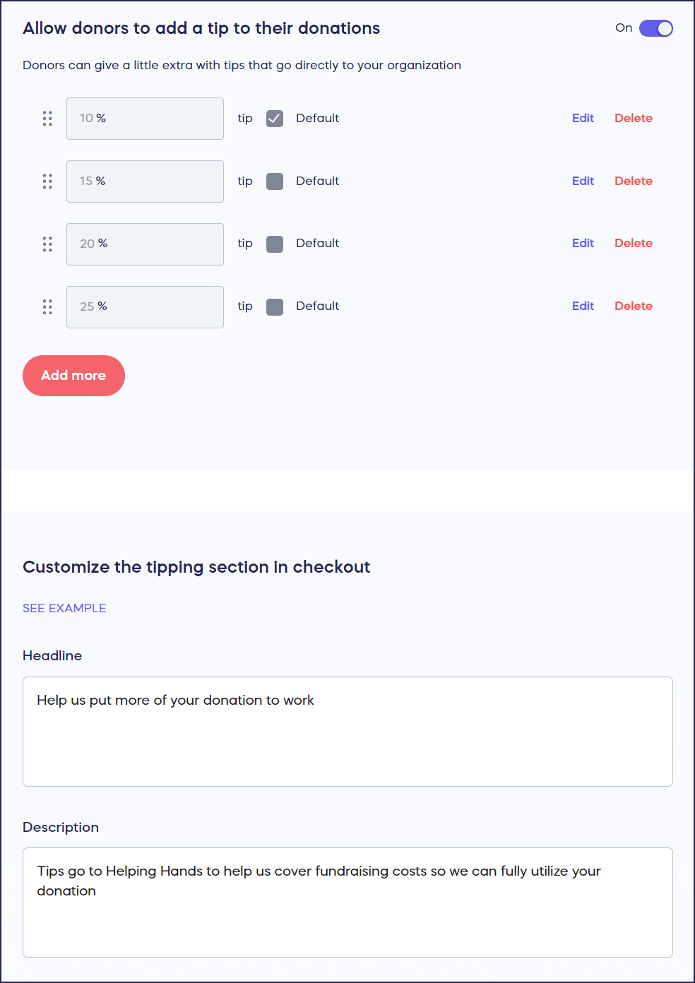 - Customize the tipping options you want to offer donors, as well as the tipping question headline and description: