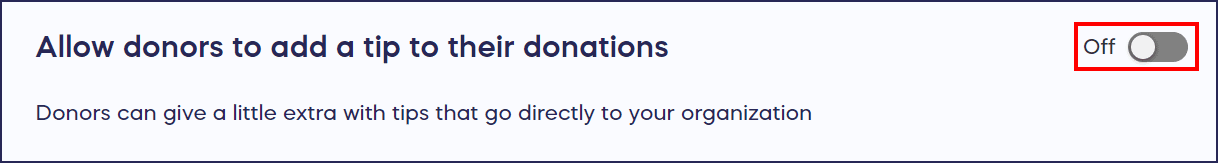 - Scroll down to Allow donors to add a tip to their donations and click on the toggle to move it to the left: