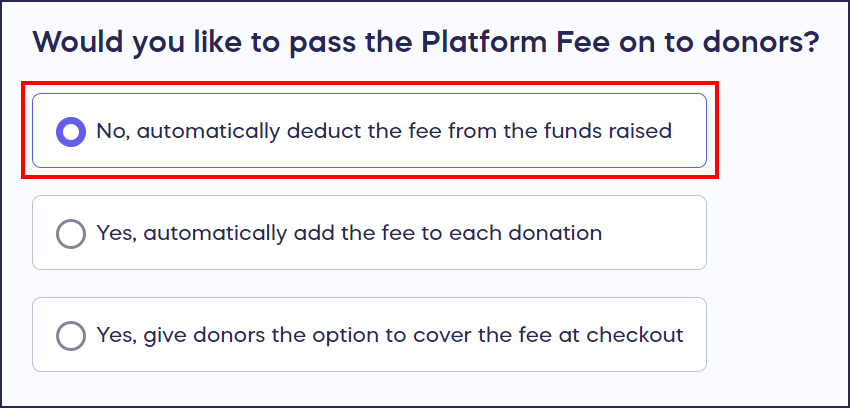 - Scroll down to Would you like to pass the Platform Fee on to donors? and select No, automatically deduct the fee from the funds raised: