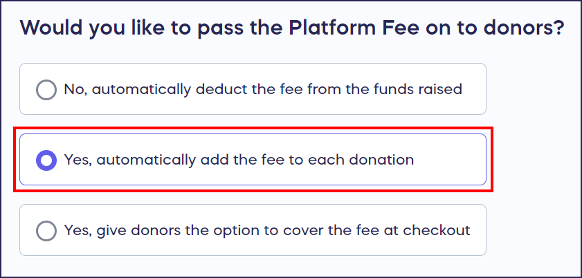With this option, the fee is automatically added to the donation, and donors cannot opt out. Note that for Campaigns, this setting is only available if you also require donors to cover the Platform Fee.