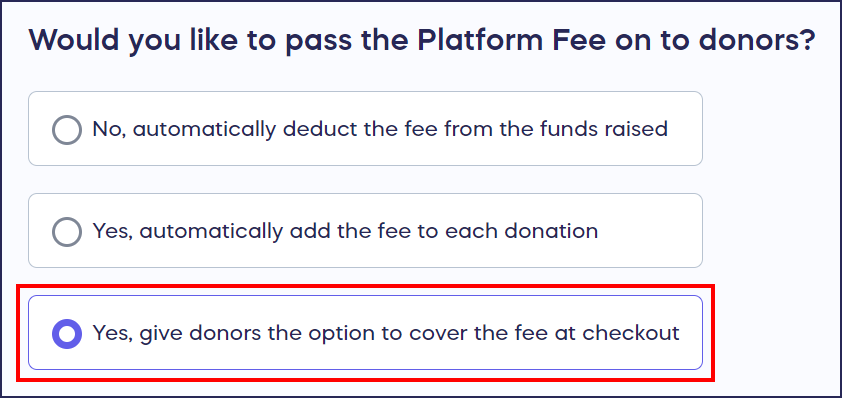 - Give donors the option to cover the payment processing fees (available if you give donors the option to cover the Platform Fee)