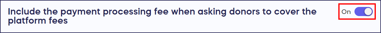 - Scroll down to Include the payment processing fee when asking donors to cover the Platform Fee and click on the toggle so it shifts to the right:
