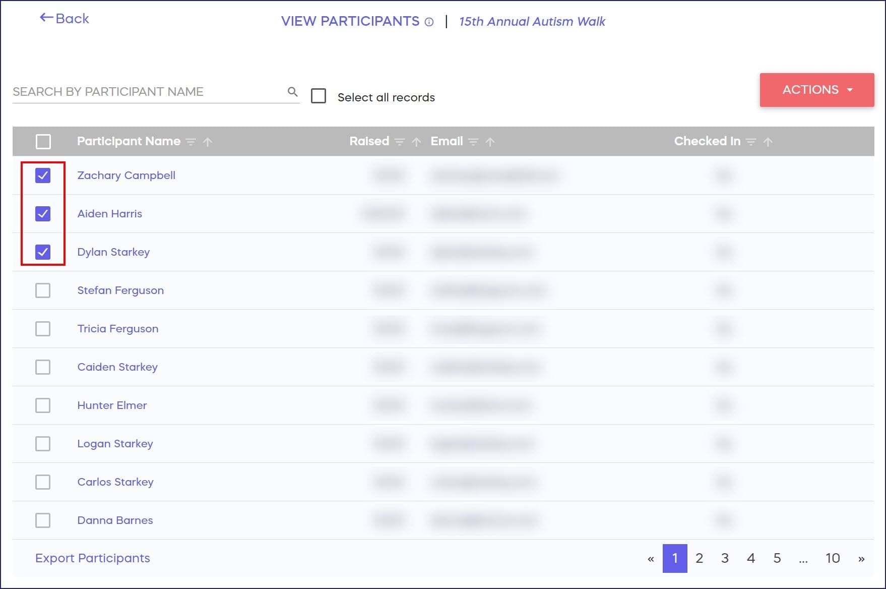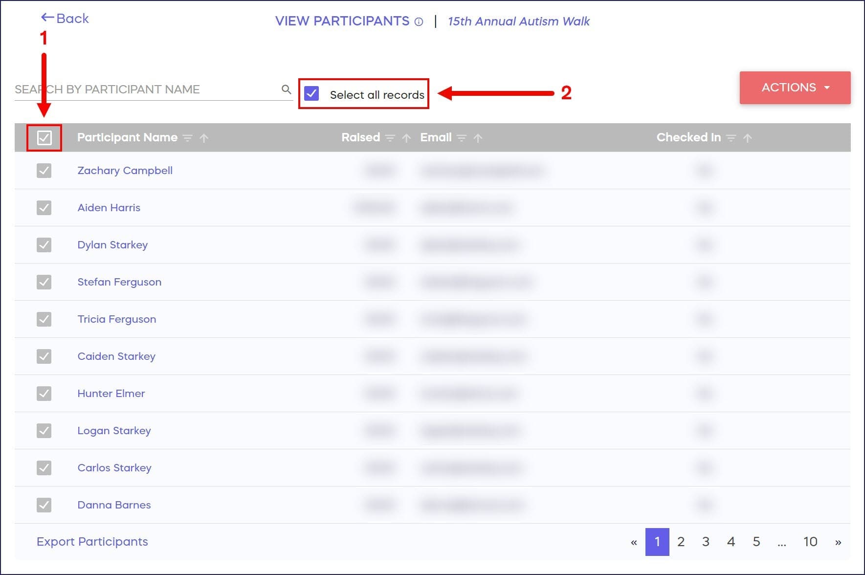 Note that if you only check the box next to Participant Name and don’t check the box next to Select all records, only the Participants on the first page will be selected.