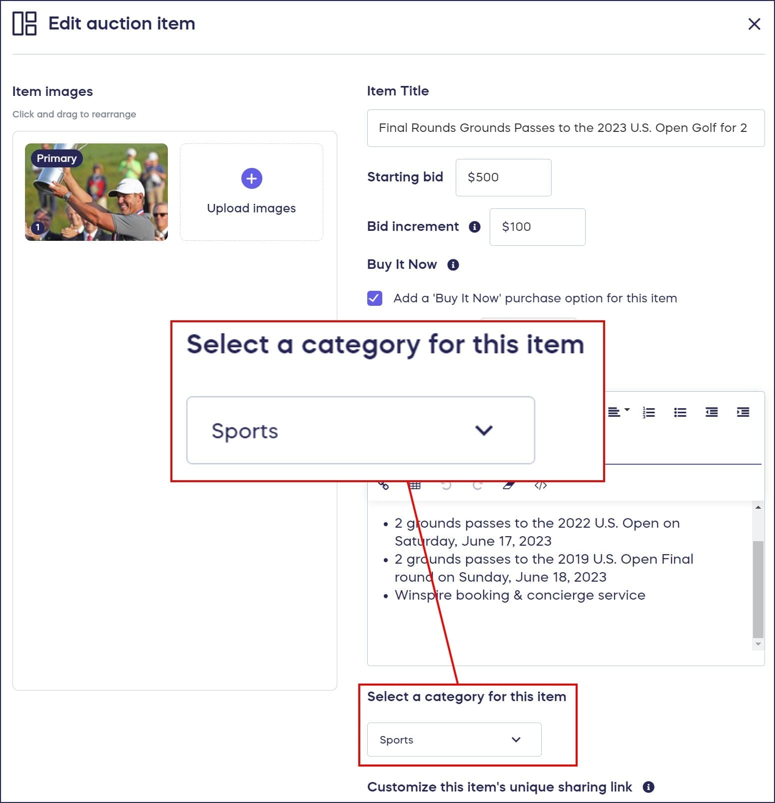 - Scroll down to Select a category for this item* and choose the category from the dropdown menu: