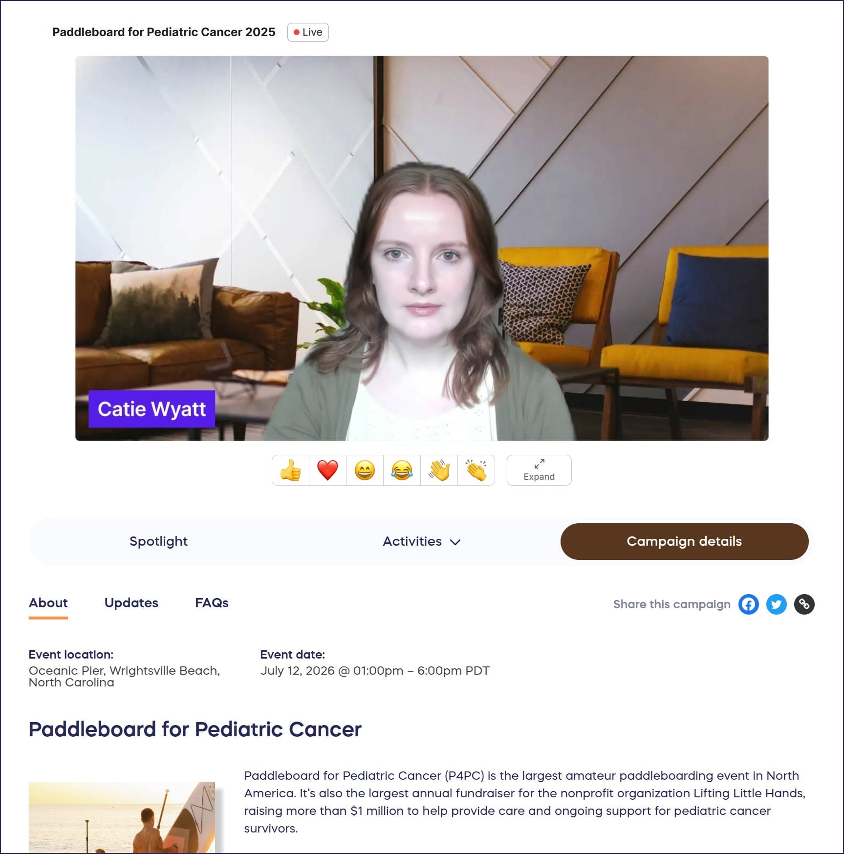 When you select Start stream mode, the appearance of your fundraising page will change from standard mode to Livestream mode: