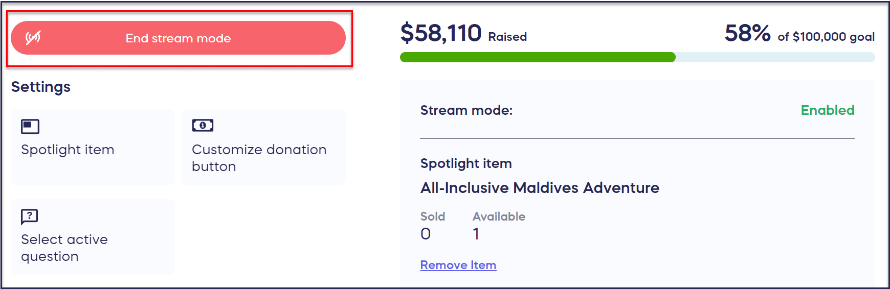 End stream mode will return your Campaign Page to its original look without the Livestream window: