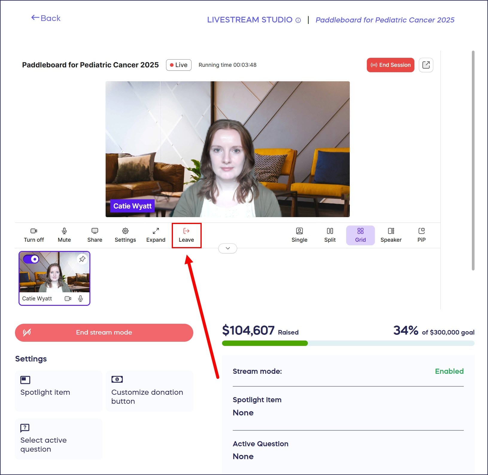 The End Session button will end the Livestream but will not remove the Livestream window from your Campaign Page: