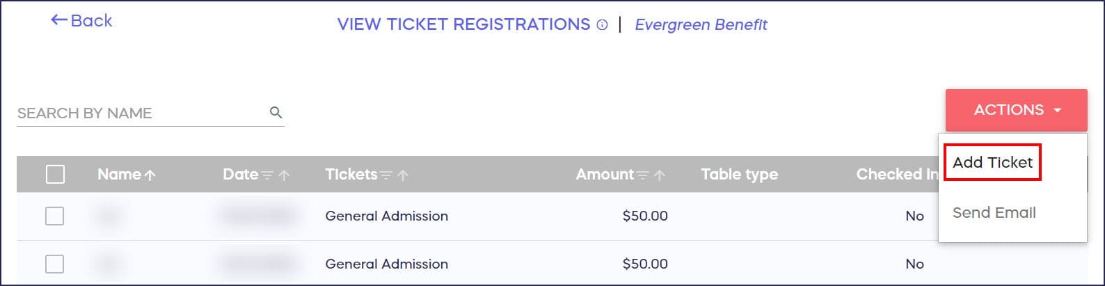 - To add a Ticket purchase, click on ACTIONS and select Add Ticket*: