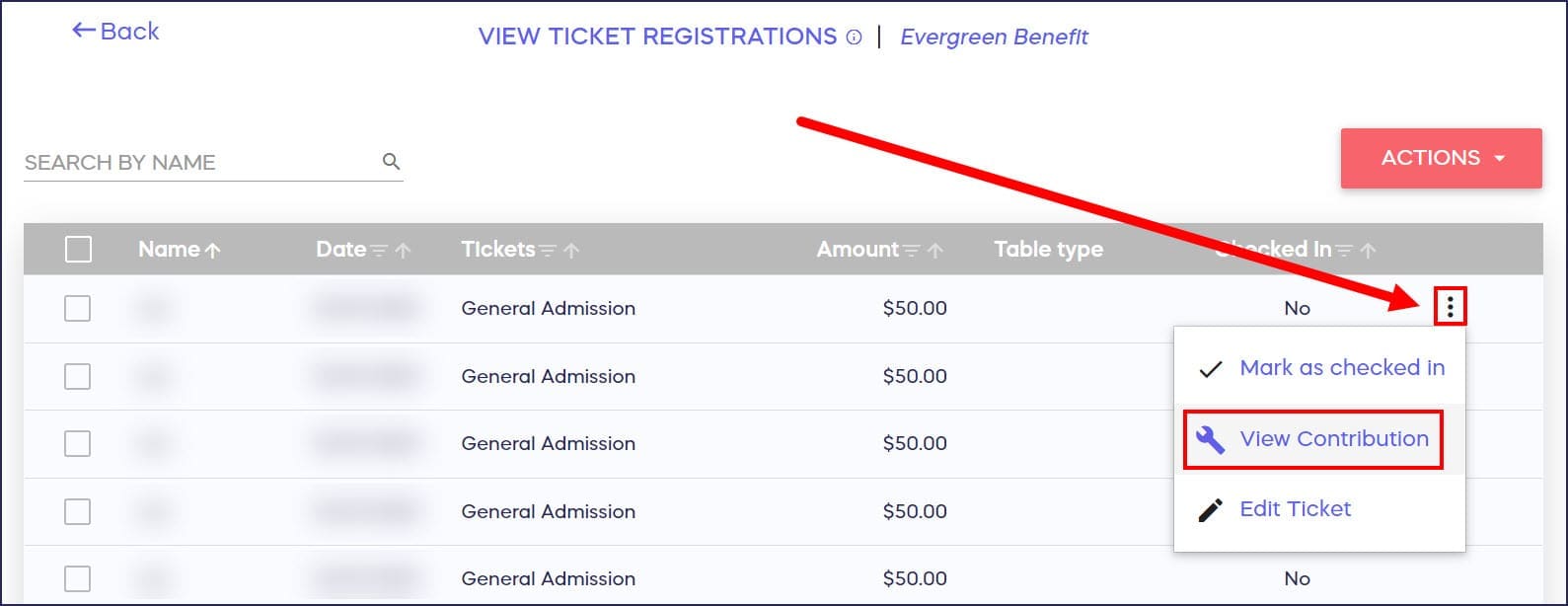 If you’re on the View Table Registrations* screen, select View tickets*, which will take you to a list of Tickets associated with that Table purchase, then select View Contribution* for each Ticket you want to refund: