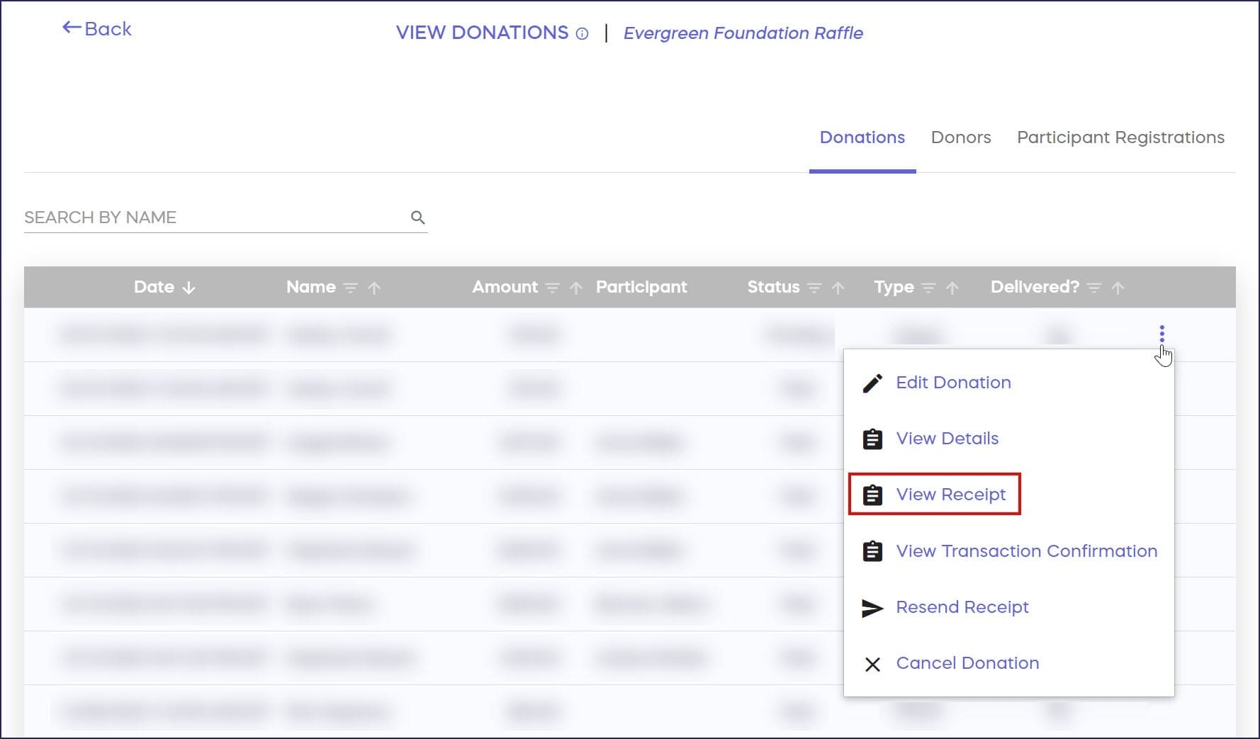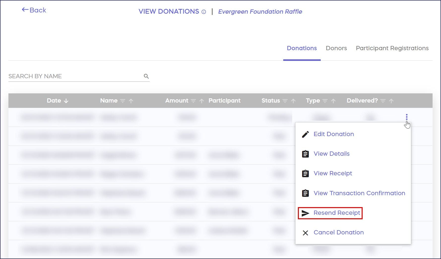 - Find the row with the donation you’re looking for, hover over it, and click on the three-dot icon that will appear on the far right:
