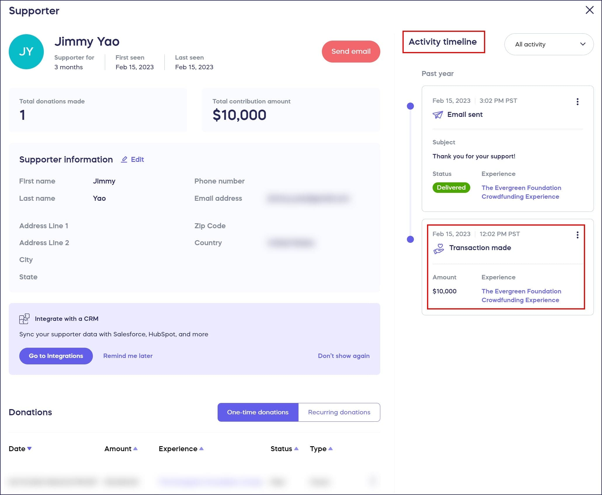 If the transaction you’re looking for was a donation, you could also find it listed under Donations below the Supporter information section.