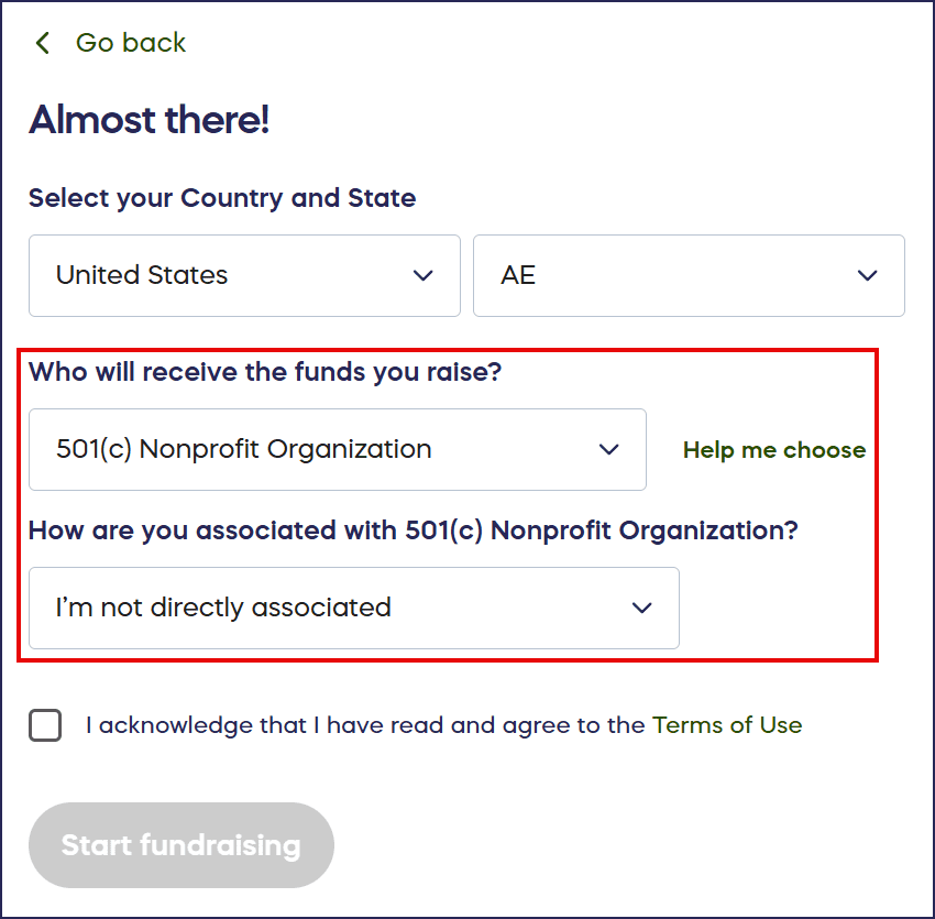 - Select 501(c) nonprofit for the “Who will receive the funds you raise?” field, then select I’m not directly associated for the “How are you associated with…?” field: