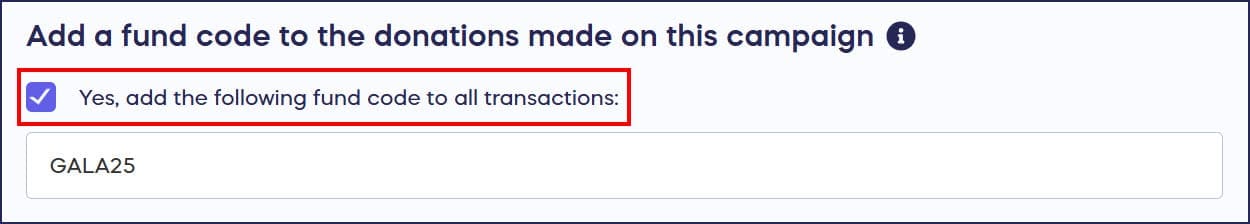 A fund code is an optional identifier you can use to “tag” transactions for accounting purposes. If you add a fund code to your Campaign settings, the system will mark each donation with the code in your RallyUp reports. You can then use the code to help track which donations came from which Campaign.