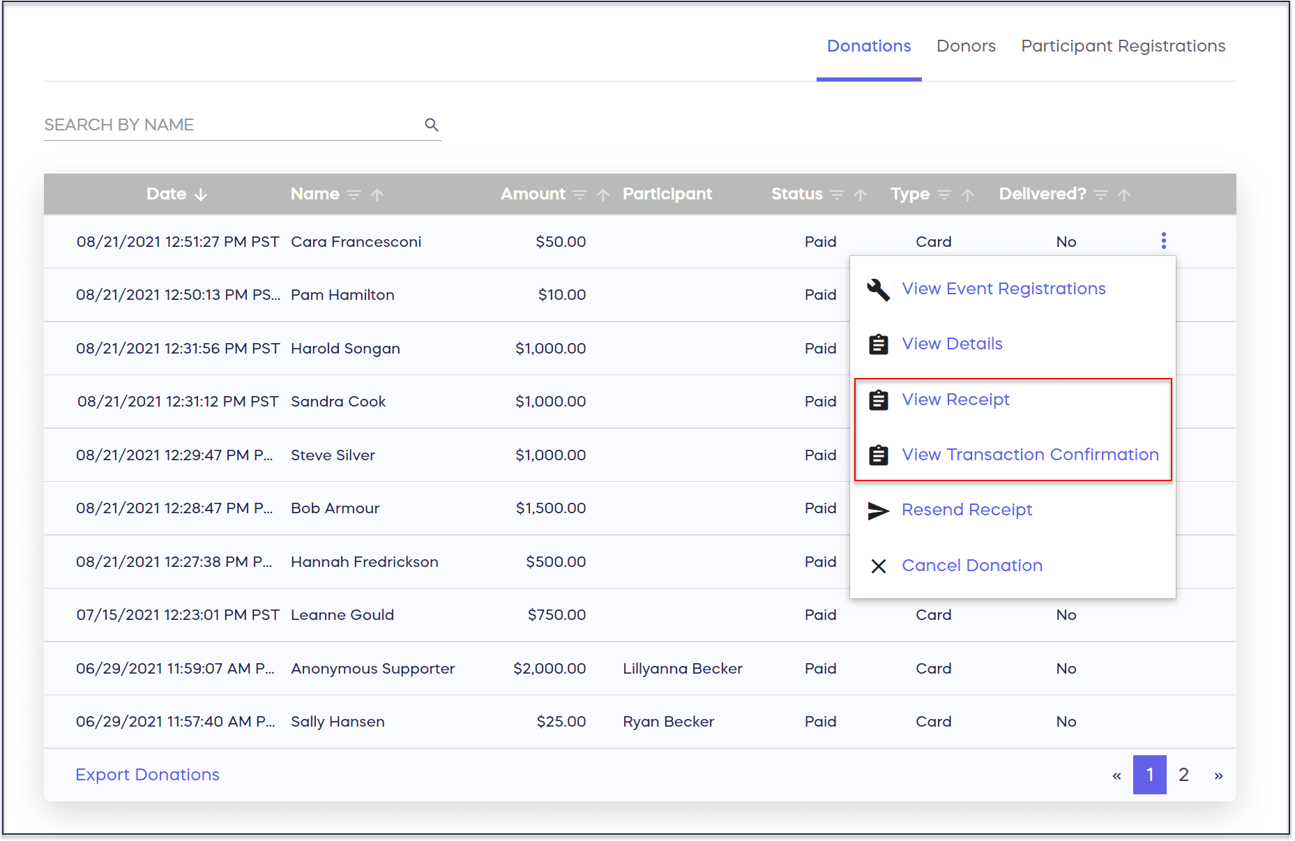If you’re running an A-Thon or Auction on RallyUp, you may note that the View Donations* page lets you view both receipts and transaction confirmations: