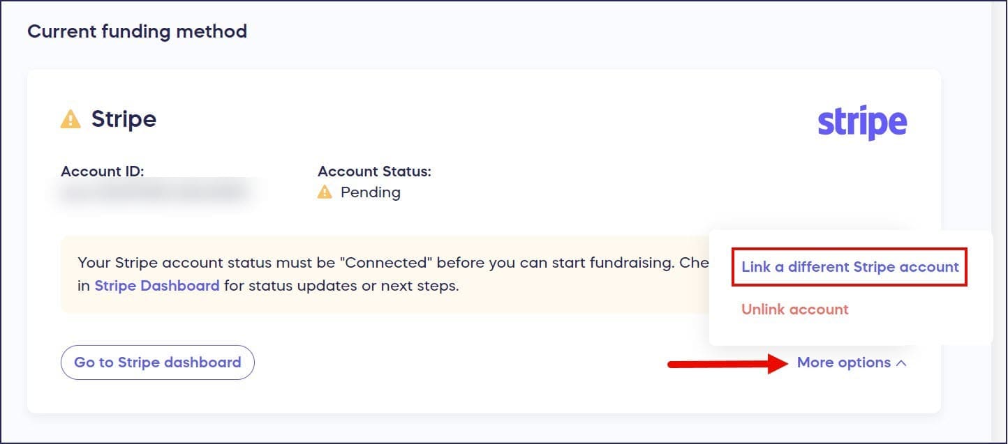 A Pending status means your Stripe or PayPal account is still being reviewed or verified. You won’t be able to start fundraising until your account status changes to Connected.
